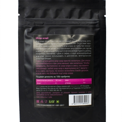 Способ использования : Агар-агар – отличная альтернатива желатину. Натуральная вытяжка из морских водорослей обладает сильным желеобразующим эффектом. Продукт является природным источником кальция, йода, железа и прочих полезных для здоровья организма компонентов.