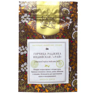 Горчица Рай целая (Mustard Indicum Rai) – оздоравливающее и восстанавливающее средство. Обладает всем необходимым набором витаминов и микроэлементов, позволяющим восстановить и сохранить здоровье. В кулинарии горчицу принято сочетать с бобовыми, с овощными и мясными блюдами. Горчицу используют для приготовления соусов и маринадов. Семена горчицы обладают омолаживающим и оздоравливающим действием. Целебные свойства: предупреждает простудные заболевания; улучшает работу иммунной системы; улучшает кровообращение; способствует ускорению обмена веществ; улучшает работу сосудов; снимает мышечную боль; нормализует пищеварение; применяется для лечения простуды. В кулинарии используют семена растения, которые рекомендуется обжарить перед добавлением в готовые блюда, поскольку это раскрывает всю палитру аромата. Термическая обработка семян позволяет быстрее пропитать готовое блюдо острым ореховым ароматом. Именно горячие зерна улучшают пищеварение, стимулируют работу кишечника.