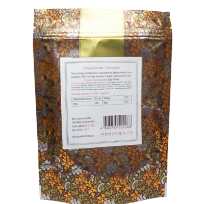 Способ использования : В основном специя используется в процессе консервирования фруктов, грибов, овощей, ягод, тем не менее замечательно сочетается с чесноком, луком, черным и душистым перцем, с корицей и прочими пряностями. От времени закладки приправы зависит и вкус блюда, при консервации стоит положить приправу вначале готовки, а в суп и компот- за 5 минут до готовности. Гвоздика хорошо оттенит рыбные, овощные и мясные блюда, наполнит ароматом подливки, холодные и горячие соусы, пряные смеси и пр. Довольно часто ее добавляют в чай и кофе.