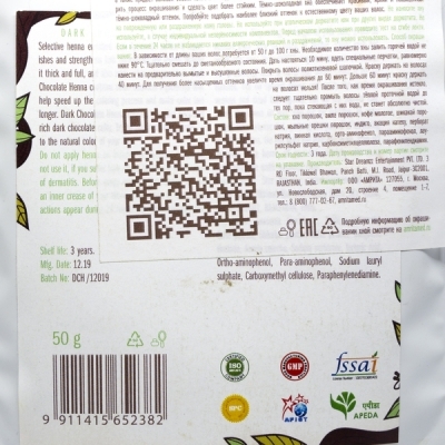 Состав : хна порошок (Lawsonia Inermis L.)- растение; амла порошок (Emblica officinalis)- растение; кофе молотое (coffe powder)- растение;  шикакай порошок (Shikakai powder)- растение; мыльные орешки порошок (ritha powder)-1% растение; индиго (indigofera tinctoria)- растение; акация катеху (acacia catechu)- растение; sodium perborate (oxidizing agent)- химия; tartaric acid (сoupling agent)- химия; orthoaminophenol (dying agent)- химия; paraaminophenol (dying agent)- химия; sodiumlaurylsulphate (surtace active agent)- химия; carboxymethyl cellulose (surtace active agent)- химия; paraphenylenediamine (dying agent)- химия dying agent)-1% химия