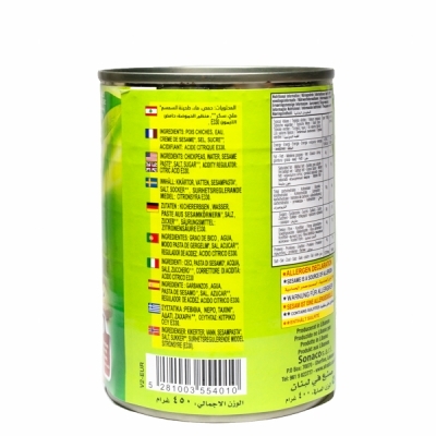 Хумус 400 гр AL RABIH Паста гороховая, торговой марки «AL-RABIH» Состав: Нут, вода, кунжутная паста, соль, сахар, регулятор кислотности –лимонная кислота Е330 Масса нетто: 400 г. Масса сухих веществ: 290 Срок годности 24 месяца Условия хранения, в том числе после вскрытия потребительской упаковки: хранить в сухом, прохладном месте. Изготовитель: «Sonaco s.a.r.l.», Адрес: P.O. Box: 70070 Street: Haret ElBellaneh-Building: Nesrawi&Karam Dbayeh-Lebanon. Страна изготовления: Ливан. энергетическую ценность 40 ккл количество белков 3г 1%, жиров 1г 2%, углеводов 3г 1% кальций: 2%, железо: 2% ,витамин А 0 %, витамин С 0 %