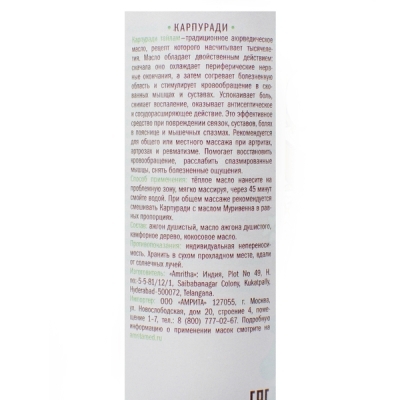Применение : Тёплое масло нанесите на проблемную зону, мягко массируя, через 45 минут смойте водой. При общем массаже рекомендуется смешивать Карпуради с маслом Муривенна в равных пропорциях.