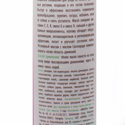 Приготовленное по древней аюрведической традиции масло Сахачаради Тайлам является незаменимым и доказавшим свою эффективность средством по уходу за ногами. Это масло эффективно при любых ревматических и проблемах с сосудами, особенно связанных с ногами.