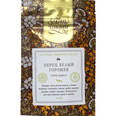 предлагаем Перец белый горошек 30 г н. Бе́лый пе́рец — Piper nigrum, семейство Перечные (Piperaceae) - специя обладает тонким и сильным ароматом, менее жгучим, чем у черного, вкусом. Белый перец получают (как и черный , и зеленый) из плодов перечной лианы. Это зрелые семена перца чёрного (Piper nigrum), лишённые околоплодников. Имеет светло-серый цвет, имеет благородный и сильный аромат. Белым перцем иногда заменяют черный, если требуется менее острый вкус и нежелательны черные вкрапления. Белый перец прекрасно гармонирует с блюдами из мяса, птицы, рыбы, морепродуктов, овощах. Традиционно белый перец используют в составе фарша, колбас, паштетов, в начинке для пирогов и пельменей, в заливных, соусах. Все специи Золото Индии - 100 % натуральные, без примесей и добавок.
