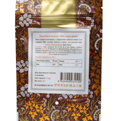 Способ использования : Дробленный белый перец придает легкую жгучесть и пряность мясным, рыбным блюдам, блюдам из птицы и морепродуктов. Прекрасно гармонирует с луком, чесноком, паприкой, горчицей, имбирем и пр. Можно добавлять специю в выпечку, маринады, подливы и соусы.