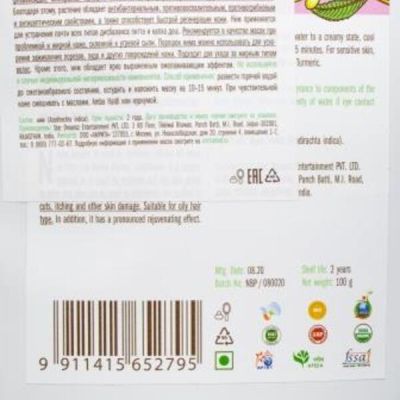 Способ применения : развести горячей водой до сметанообразного состояния, остудить и наложить маску на 10–15 минут. При чувствительной коже смешивать с маслами, Amba Haldi или Куркумой.