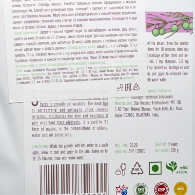Применение : Развести порошок горячей водой до состояния кашицы, остудить и наложить маску на 10-15 минут, смыть теплой водой. Для восстановления упругости груди: Заварить порошок кипятком, дать настояться 10 минут, затем смешать с топленым маслом и делать легкий массаж груди и области декольте. Антивозрастная маска: Смешать 1 ч.л. шатавари, 0,5 ч.л. трифалы, 3 ч.л. топленого масла и 1 ч.л. масла миндального, моринги, кунжутного. Все тщательно смешать и наложить на очищенную кожу лица. Через 30 минут смыть теплой водой.