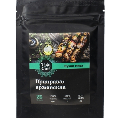 Приправа армянская «Холи Ом» несёт в себе неповторимое очарование традиционной армянской кухни. Кориандр придаёт блюду пикантный вкус, а орегано в сочетании с тимьяном добавляет свежую остроту и неповторимый аромат. Смесь специй позволяет ощутить одновременно сладкую, горькую и острую нотку вкуса готового блюда. Универсальная армянская приправа подходит для приготовления овощей, мяса, первых блюд, а также отлично раскрывает вкус маринованного мяса и птицы.