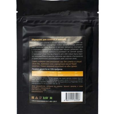 Состав : чеснок сушеный в гранулах, куркума, перец красный и черный, орегано, горчичное желтое семя, лук зеленый, красная паприка, зелень петрушки и укропа, базилик.