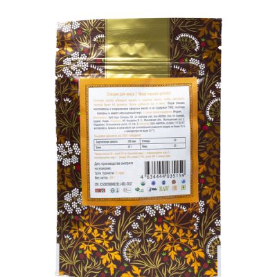 Состав : Red Chilli (перец чили), Coriander seed (кориандр зерно), Cumin seed (кумин зира семена), Black Pepper (перец черный), Cinnamon stick (корица палочки), Black Cardamon (кардамон черный), Сlove (гвоздика), Bay leaves (лавровый лист), Rock Salt (соль), Turmeric (куркума), Garlic (чеснок), Fennel seed (фенхель семена), Star Anis (бадьян ), Mustard Yellow (горчица желтая), Ginger (имбирь), Onion Powder (лук сушеный молотый), Nutmeg (мускатный орех). Все специи Золото Индии - 100 % натуральные, без примесей и добавок.
