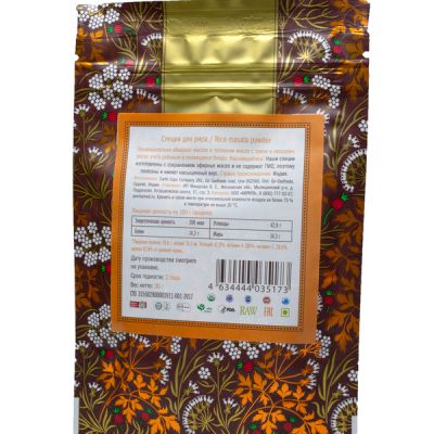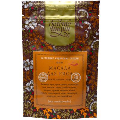 Состав : Coriander seed (кориандр зерно), Cumin seed (кумин семена), Kashmiri chilli (кашмирский чили), Fennel seed (фенхель семена), Fenugreek seed (шамбала семена), Tamarind (тамаринд), Turmeric (куркума), Black cardamom (кардамон черный), Garlic (чеснок), Black pepper (перец черный), Nut mace (мацис), Mustard rai (горчица рай), Assafoetida (асафетида), соль гималайская (Rock salt).Ароматная смесь пряностей и специй прекрасна как для приготовления мясного или вегетарианского плова, так и для придания привычным блюдам из макарон, бобовых и овощей восточных нот. Рекомендуем вносить специи за 3-5 минут до готовности.