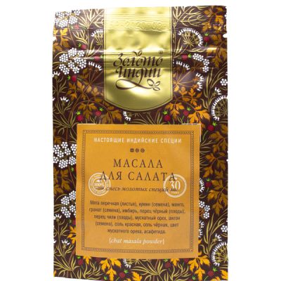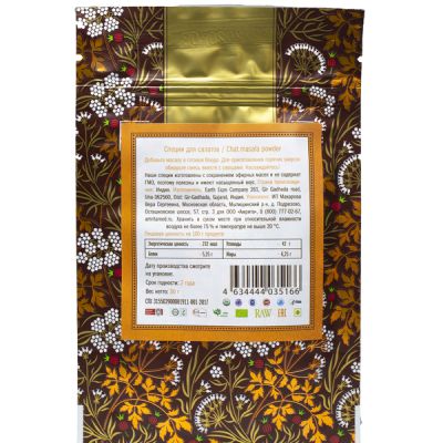 Способ использования : Масала добавит легкую кислинку и специфический восточный аромат салатам из фруктов и овощей. Смесь специй используется в некоторых видах национальных индийских закусок. Ингредиенты смеси гармоничны в блюдах их картофеля и бобов.