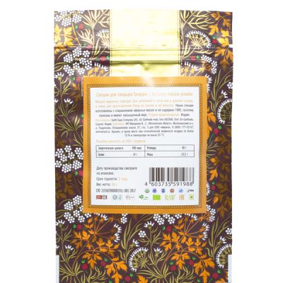 Состав : Coriander Seeds (кориандр зерно), Cumin Seeds (зира семена), Fennel Seeds (фенхель семена), Cinnamon Stick (корица палочки), Black Pepper (перец черный), Green Cardamom (кардамон зеленый), Black Cardamom (кардамон черный), Clove (гвоздика), Nut Meg (мускатный орех), Nut Mace (мацис), Star Anis (бадьян), Red Chilli (перец чили), Turmeric (куркума), Salt (соль).