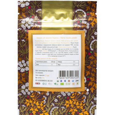 Состав : Сoriander seed (кориандр зерно), Cumin seed (кумин зира семена), Red Chilli (перец чили), Dry Mango (манго зеленый), Fenugreek leaves (шамбала листья), Bay leaves (лавровый лист), NutMace (мацис), Nutmeg (мускатный орех), Black Pepper (перец черный), Cinnamon stick (корица палочки), Garlic (чеснок), Clove (гвоздика), Black Cardamom (кардамон черный), Rock salt (соль), Assafoetida (асафетида).