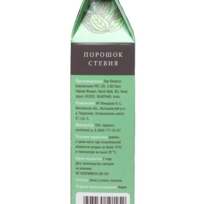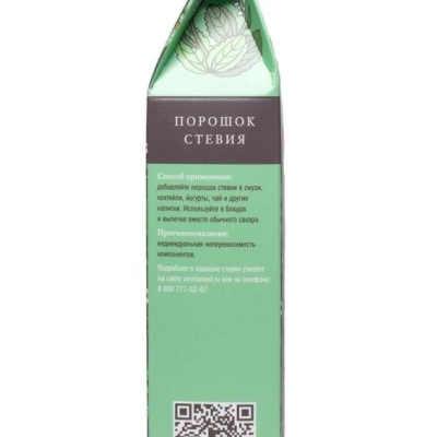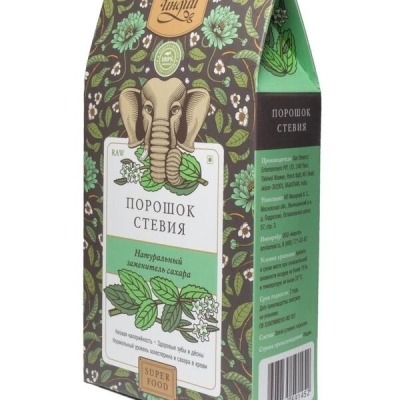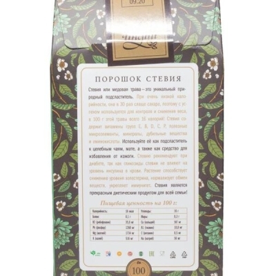 Стевия порошок (Stevia Powder) — природный подсластитель, безопасный для диабетиков. В стевии содержится большое количество витаминов, аминокислот и микроэлементов. Она оказывает благотворное влияние на сердечно-сосудистую систему, органы пищеварения, печень и желчный пузырь, иммунную систему, зубы и десны. Как сахарозаменитель стевию рекомендуют диабетикам, поскольку она регулирует уровень сахара в крови, влияет на снижение холестерина, выводит радионуклиды и стимулирует выработку поджелудочной железой инсулина. Способ применения Добавляйте стевию в любые блюда по вкусу, чтобы подсластить их. Используйте в блюдах вместо обычного сахара.