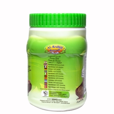 Тахина (пластик банка) 454 гр AL RABIH Тахина (паста кунжутная) торговой марки «AL-RABIH» Состав: 100 % перемолотых семян кунжута. Масса нетто: 454 гр. Срок годности: 24 месяца с даты производства, указанной на упаковке. Условия хранения: в сухом прохладном месте, после вскрытия упаковки хранить в холодильнике и употребить в течение 21 дня. Изготовитель: «SONACO s.a.r.l.», P.O.Box: 70070 Street: Haret ELBellaneh,Building:Nesrawi&Karam Dbayeh,Ливан. Рекомендации: Перед употреблением взбалтывать, может быть аллергенно. Пищевая ценность на 100 гр. продукта: Жиры: 60 гр., в т.ч насыщенные:10 гр.,Белки:20 гр., Углеводы: 13 гр.,в том числе сахара:3 гр., Соль: 83 мг., Пищевые волокна (клетчатка): 0 гр., холестерин 0 мг, натрий 83 мг, витамин D 0мг, кальций 333 мг, железо 15 мг, калий 413 мг Энергетическая ценность на 100 гр. продукта: 2773 Кдж./ 666 Ккал.