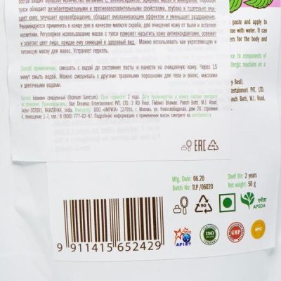 Тулси - известный аюрведический препарат, который представляет собой листья растения базилика священного. Тулси традиционно является отличным детоксом, предотвращает преждевременное старение, обладает антиоксидантным и омолаживающим свойством. Маска Тулси прекрасно освежает кожу и повышает ее тонус, ускоряет регенерацию клеток, борется со свободными радикалами, улучшает кожный кровообмен. Кожа выглядит здоровой и сияющей. Тулси обладает прекрасными антисептическими свойствами, что позволяет эффективно бороться с покраснением, раздражением и кожным зудом. Также маски из тулси будут хороши и просто в конце дня, чтобы удалить из кожи все загрязнения, уличную пыль и остатки косметики.